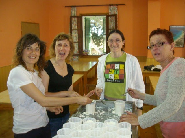 Emplenant els motlles per fer el formatge.